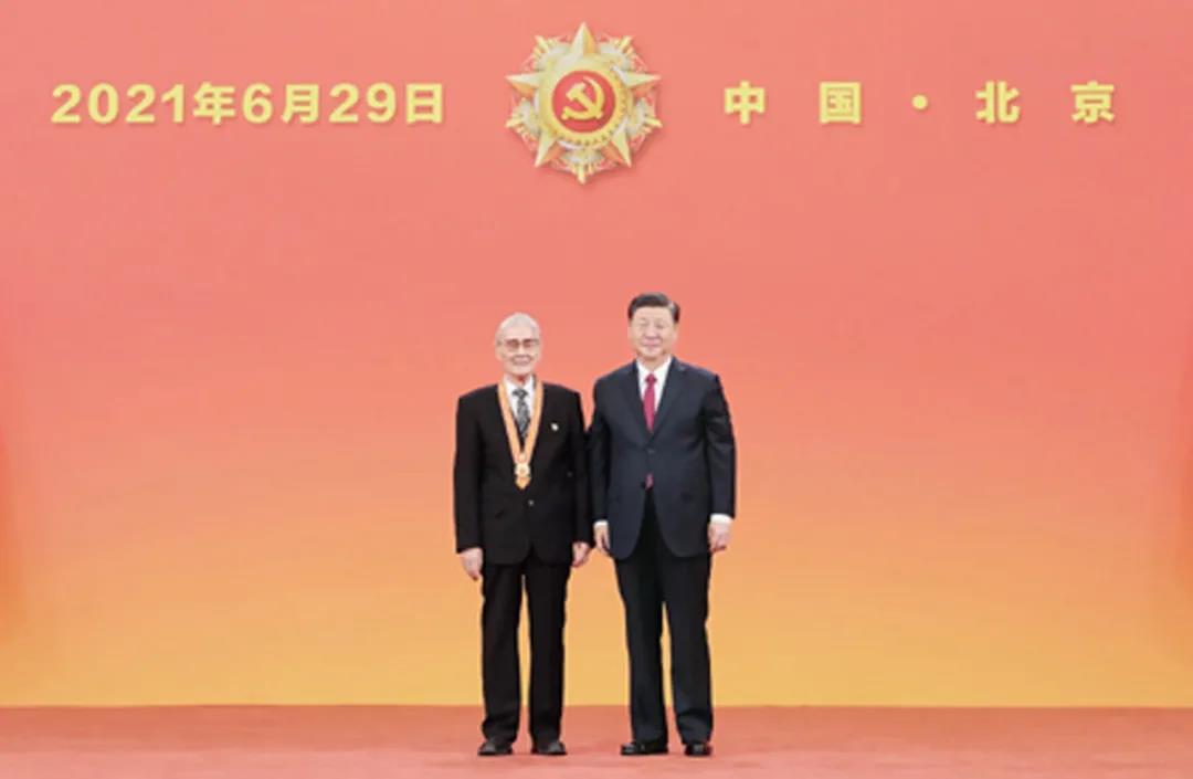 6月29日,庆祝中国共产党成立100周年“七一勋章”颁授仪式在北京人民大会堂金色大厅隆重举行。中共中央总书记、国家主席、中央军委主席习近平向“七一勋章”获得者蓝天野颁授勋章。新华社记者 李学仁 摄