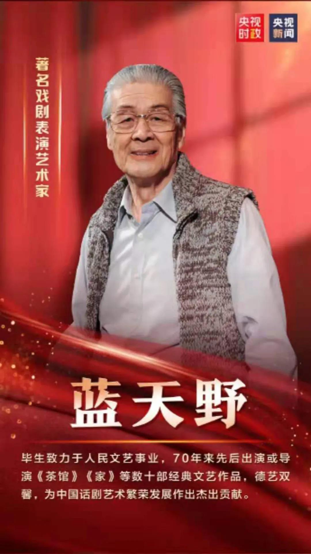 蓝天野 汉族,1927年5月生,1945年9月入党,河北饶阳人,北京人民艺术剧院演员、导演。将一生奉献给人民文艺事业。青年时代参加革命,从事进步文艺活动。解放后,出演或导演《蜕变》《茶馆》《家》等数十部优秀文艺作品,塑造众多经典人物形象。传承艺术艺德,发掘和培养一大批文艺界领军人才,为中国话剧艺术繁荣发展作出重大贡献。荣获“全国优秀共产党员”称号和“中国戏剧奖·终身成就奖”等。