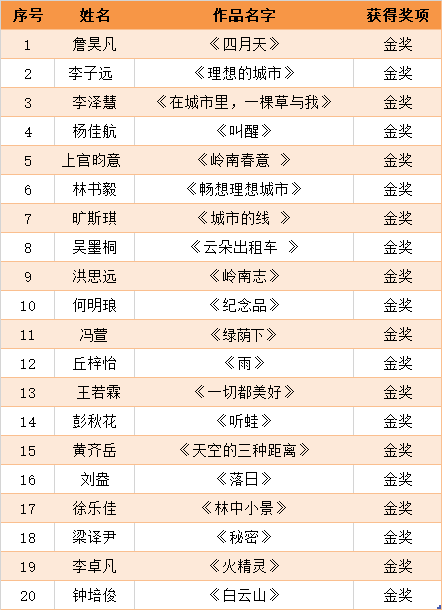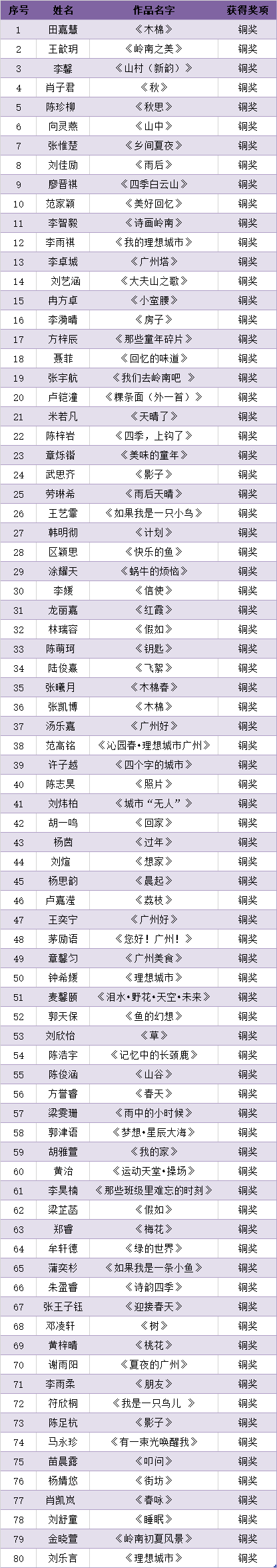 首届珠江儿童诗歌奖以“理想城市”“美好回忆”“岭南风物”为主题,广泛向国内16岁以内的少年儿童征集现代诗和旧体诗。截止2021年6月1日,共收到参赛作品700多件。经评委初评,共有170个作品进入复选(网络票选)。最终,结合网络票选结果和评委意见,终评出金奖20名、银奖50名、铜奖80名、网络最佳人气奖20名。