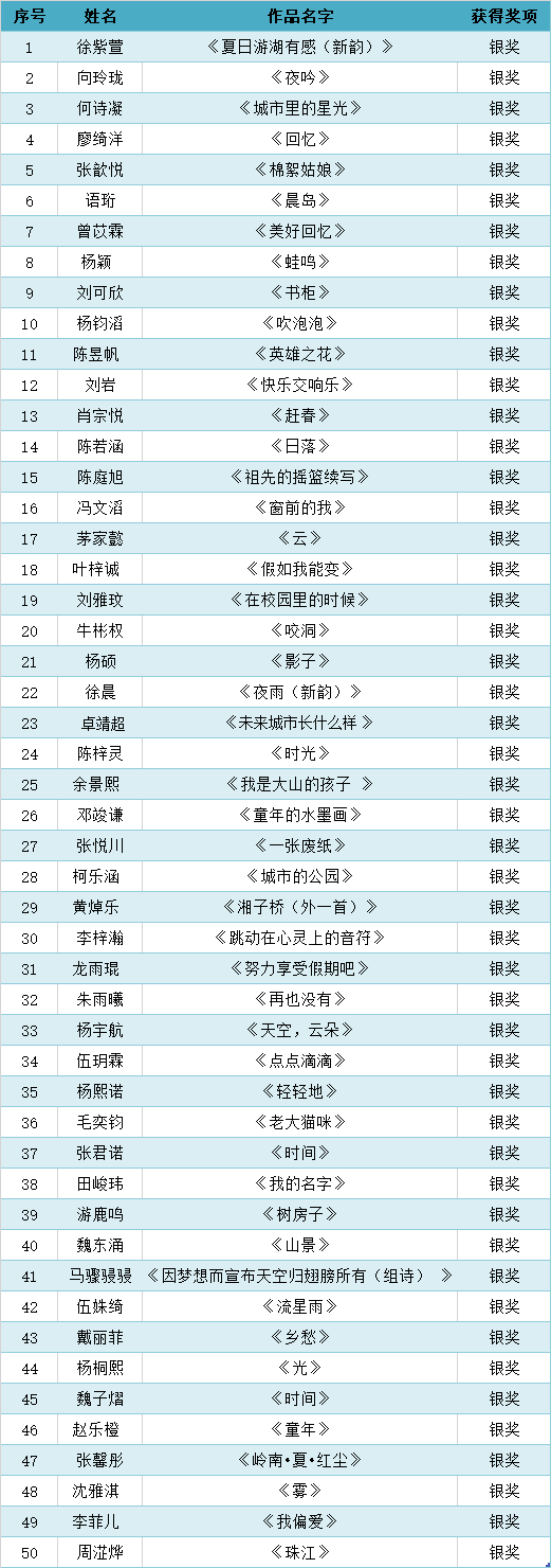 “诗歌是人类的心灵之声,是我们的生命中的一束光;诗歌也是一种美的教育。每个孩子都是天生的诗人,他们用纯真、善良的童心和丰富的想象力创造出许多动人的诗篇,‘珠江儿童诗歌奖’为小诗人们提供了一个展示心灵的空间,让孩子们能在这个平台上发出自己的声音。” 本届珠江儿童诗歌奖评委、中国少数民族文学骏马奖得主冯娜说。