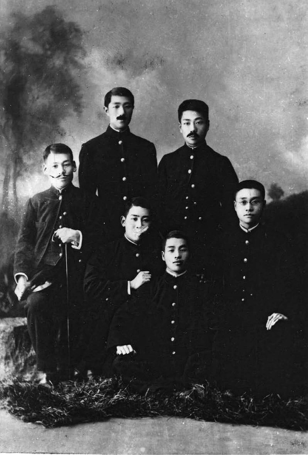 1905年秋摄于日本仙台。鲁迅与同住在“宫川宅”公寓的五名住宿学生在仙台东一番丁照相馆合影。前排左起:三宅、矶部浩策、吉田林十郎、施霖;后排左起:大家武夫、鲁迅。这张照片是鲁迅赠给公寓主人宫川信哉留念的。八年后的1913年,当时照片中的一个人回来拜访房东宫川信哉,宫川想象其中三人拍完照片十年后的样子,为他们添上了胡子。他还在照片的背面写道:“明治三十八年X月影,拾年后想象髪,大正二年现在,大家君在美国,周君不明,三宅君在大学小儿科,矶部君在米泽县,吉田君在朝鲜,施君不明。”(“想象髪”是“想象髭”(即胡须)的误笔。)