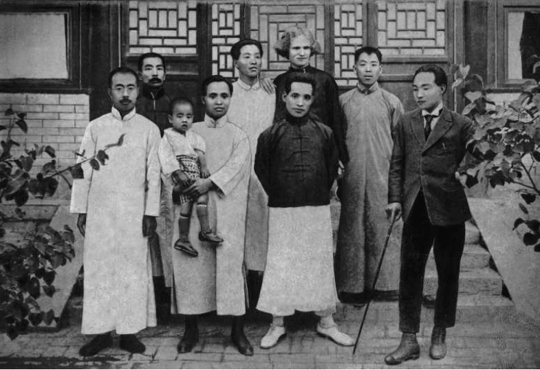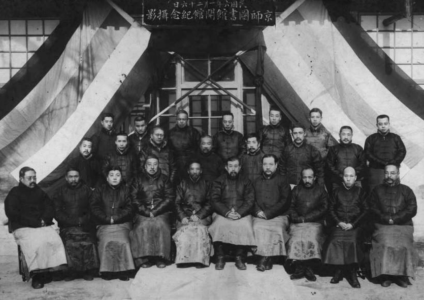 1917年1月26日摄于北京。图为京师图书馆新馆开馆纪念合影。第二排左起第五人为鲁迅,第一排左起第五人为时任北京大学校长蔡元培,第二排左起第四人为时任社会教育司司长夏曾佑。