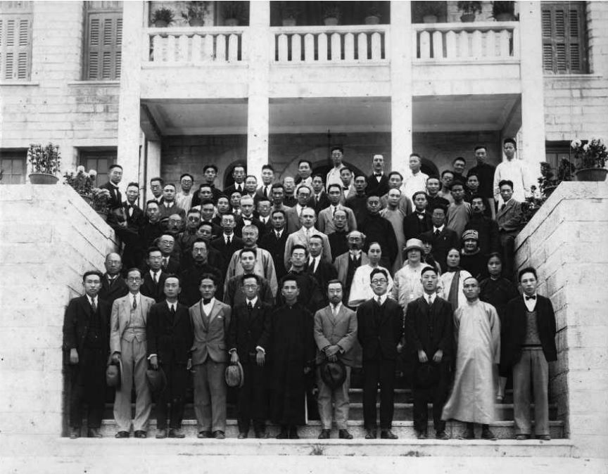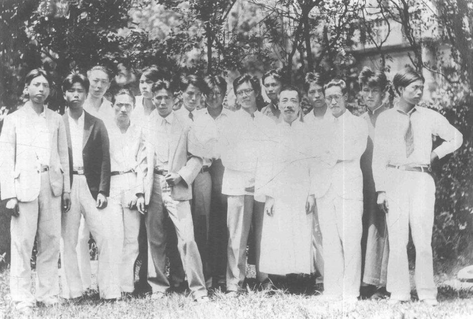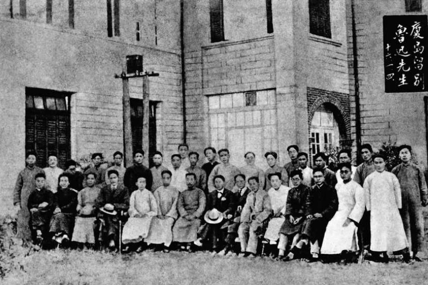 1927年1月4日摄于厦门。在全校师生送别鲁迅合影后,文科学生特邀鲁迅在群贤楼后面另照一相,“泱泱”“鼓浪” 两个文学社学生也参与了此次合影。前排左七为鲁迅。