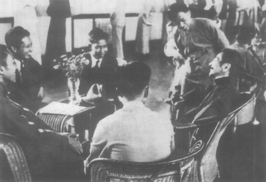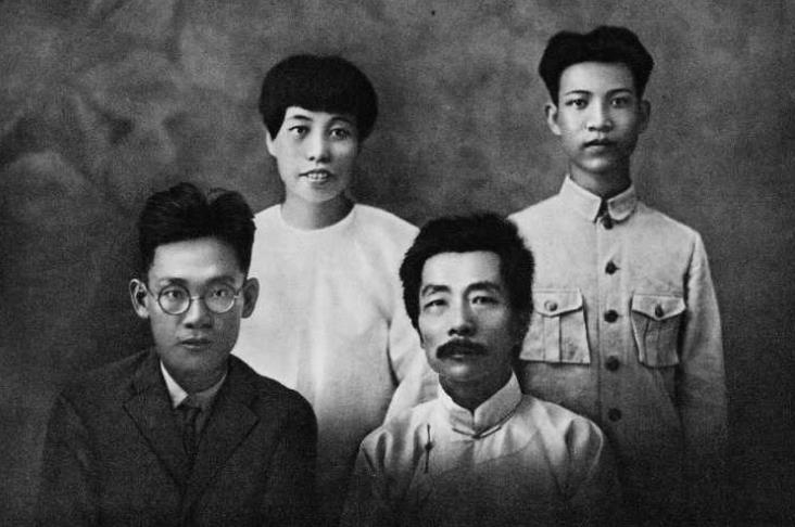 1931年4月20日摄于上海。编订左联机关刊物《前哨》创刊号后,鲁迅与冯雪峰两家一同合影留念。据冯夏熊(冯雪峰之子)回忆说,拍这张照片时,许广平刚哭过,眼泪未干头微低。因为左联成员柔石刚被杀害,鲁迅一家正经受着悲痛的煎熬。《前哨》创刊号即为“纪念战死者专号”。