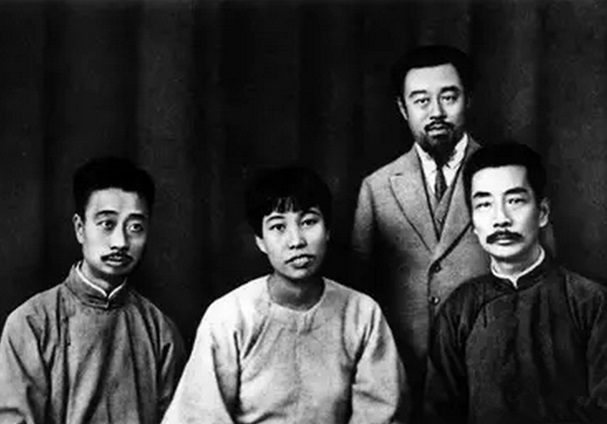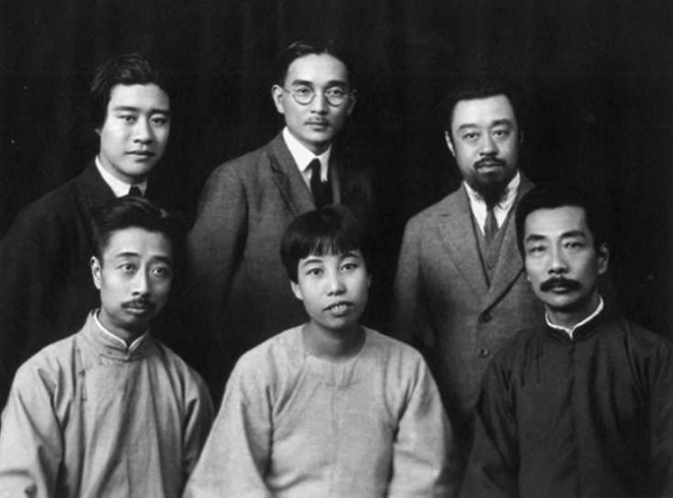 1927年10月4日摄于上海。鲁迅到达上海与亲朋好友合影。鲁迅当日日记中记载:“午前伏园、春台来,并邀三弟及广平至言茂源午饭,玉堂亦至,下午六人同照相。”前排右起:鲁迅、许广平、周建人;后排右起:孙伏园、林语堂、孙福熙。值得一提的是,鲁迅与林语堂原为好友,后交恶。在1977年文物出版社出版的《鲁迅》照片集中,林语堂被抹掉了。在这张照片中,孙福熙与林语堂一同被抹掉。此外,林语堂还在另外两张照片上也被抹去。
