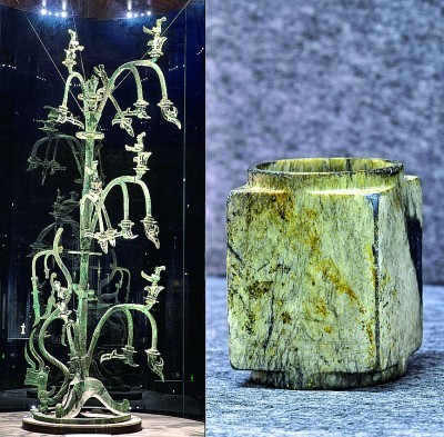 左图:青铜神树 右图:刻有神树纹的玉琮 新华社发