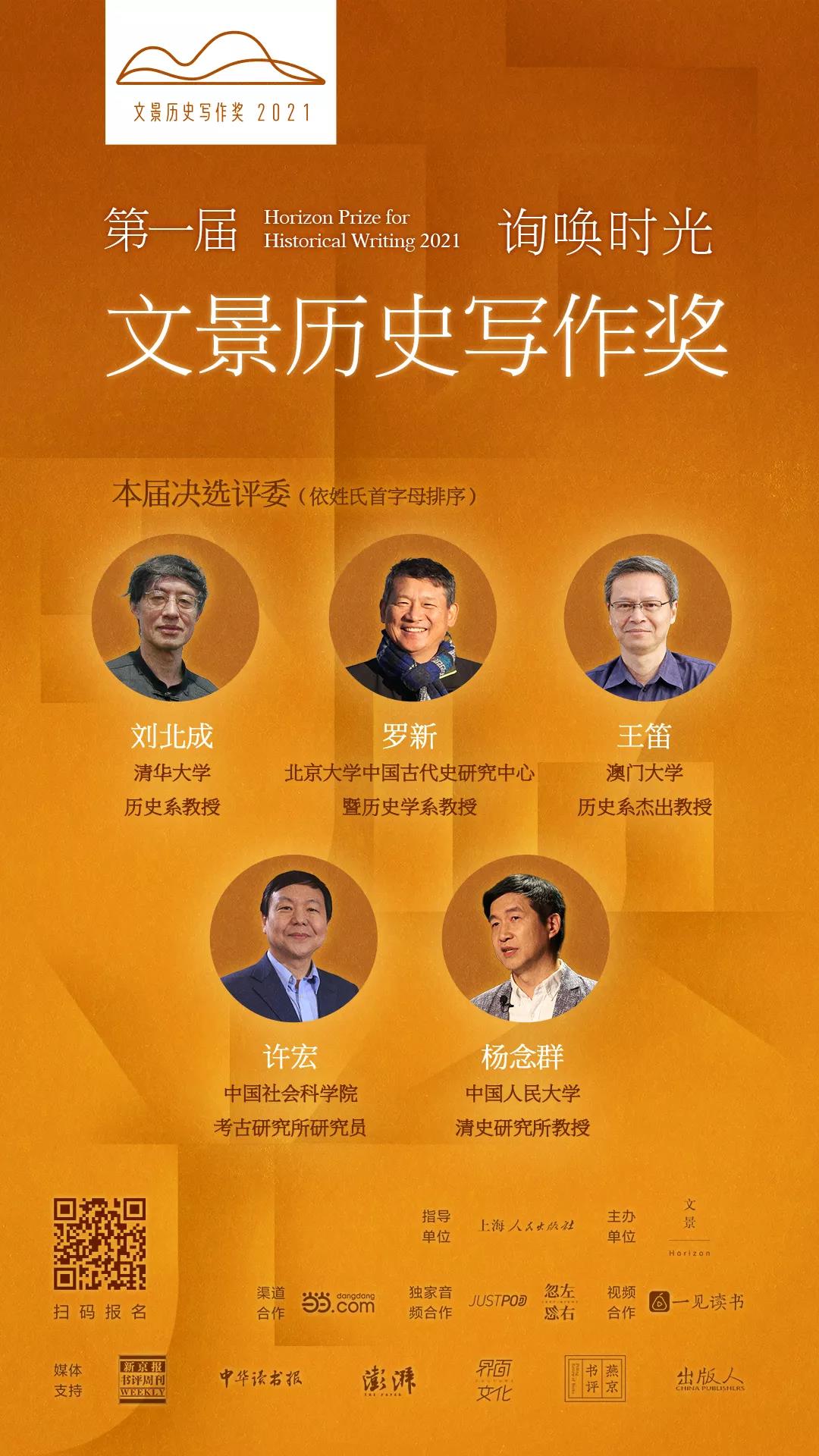 本届评选,文景邀请到了刘北成、罗新、王笛、许宏、杨念群5位历史领域的知名学者担任决选评委。同时,还邀请了10位不参加本届奖项评选的青年历史学者、资深书评人、媒体人担任初选评委。评选将分为两轮,分别选出入围十强及首奖二名,首奖得主将获得奖金8万元。入围名单将于2021年12月公布。首奖得主将于2022年1月文景历史写作奖颁奖典礼现场揭晓。