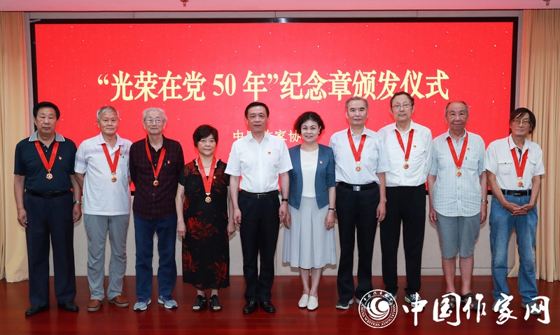 6月29日,中国作协在京开展“七一”主题党日活动,向中国作协“光荣在党50年”的老党员代表颁发纪念章
