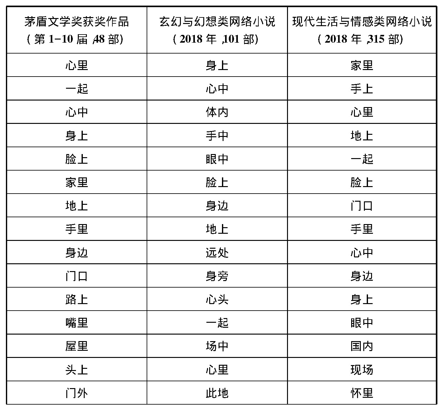 在历届茅盾文学奖获奖作品的场景高频词统计结果中,一方面,“心里”是当之无愧的第一高频词,在统计数值上遥遥领先于后面其他场景的高频词4,而且其近义词“心中”也排在第三位。另一方面,具体到针对每部获奖作品的分析数据中,我们也发现“心里”作为场景高频词普遍排位较高的情况,其中“心里”作为第一场景高频词的作品有28部,作为第二场景高频词的作品有10部,作为第三场景高频词的作品有2部,此外还有2部作品的第一场景高频词为“心中”———即“心里”的同义词。5而在2018年中国101部玄幻与幻想类网络小说的场景高频词统计结果中,“心里”的次序则比较靠后(仅为第14位),而与其意思相近的“心中”“心头”排名则相对靠前,分别为第2和第11位。在2018年中国315部现代生活与情感类网络小说的场景高频词统计结果中,“心里”和其近义词“心中”则分别位列第3和第9。