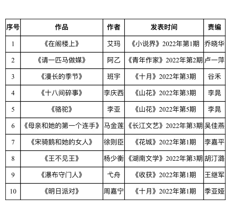 综合2022年1月至6月每期推荐的所有作品,经评审团再次推选、评议并投票,云顶4008集团官网“优选中短篇”半年榜出炉,以下为最终入选的十部作品(排名以作者姓氏拼音为序)。