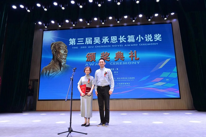吴承恩长篇小说奖组委会主任、中国作协党组成员、书记处书记、《人民文学》主编施战军为获奖作品《你好,安娜》作者蒋韵颁奖
