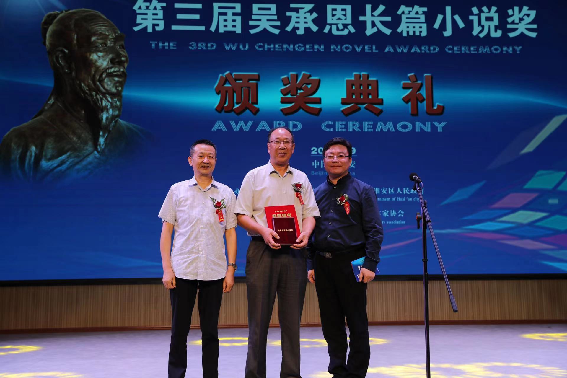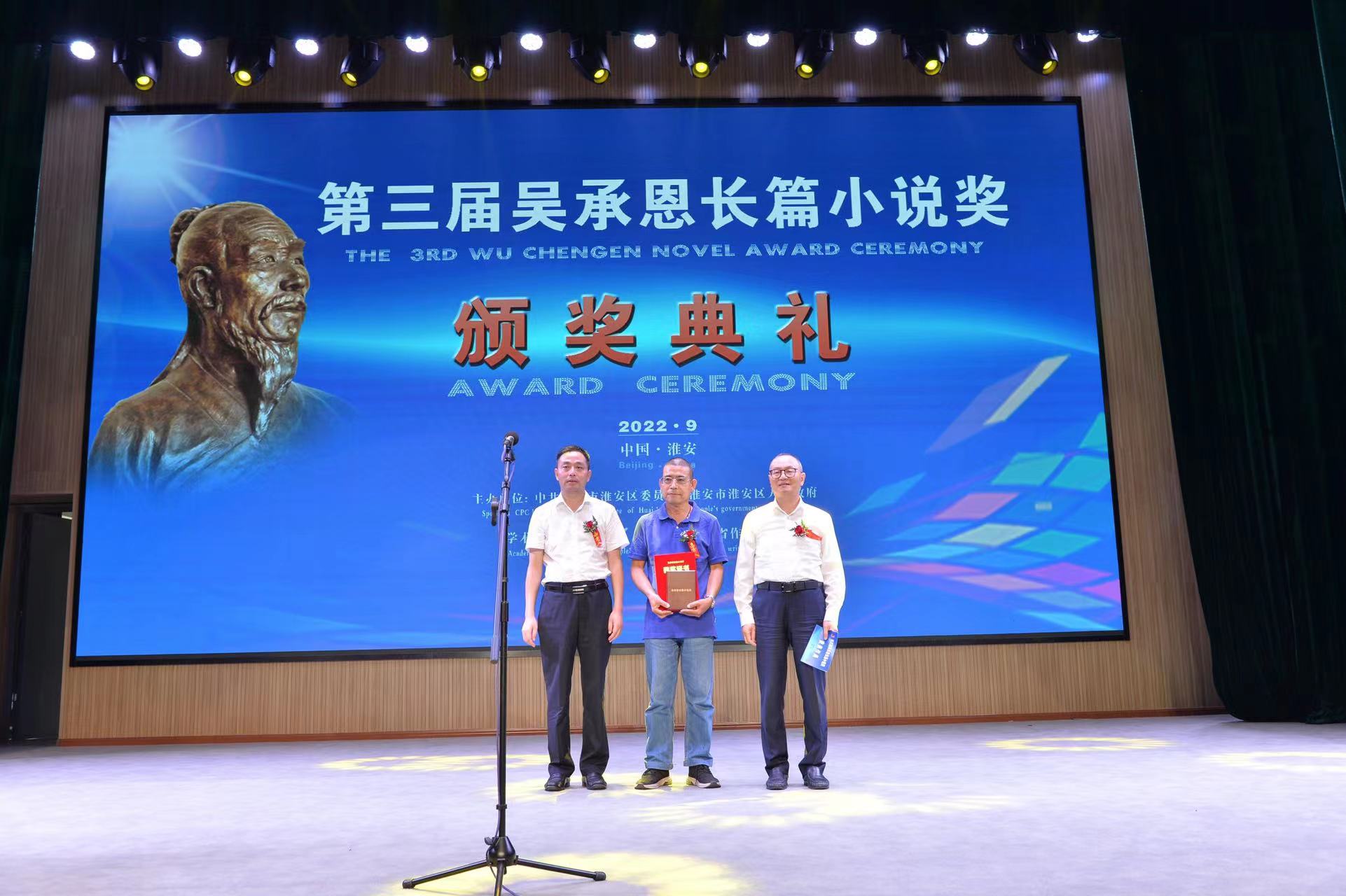 9月11日,备受社会各界关注和文坛瞩目的第三届吴承恩长篇小说奖颁奖典礼在江苏省淮安市淮安区举行。共有7部长篇小说获奖,分别是邓一光的《人,或所有的士兵》、蒋韵的《你好,安娜》、王晋康的《宇宙晶卵》、胡学文的《有生》、张平的《生死守护》等5部全国性获奖作品,以及2部淮安籍本土作品,即于兆文的《大胡庄•1941》和魏嘉陵的《特别党产》。