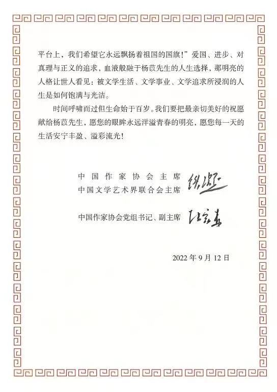 2022年9月12日,是我国著名翻译家、作家杨苡先生的103岁华诞。中国作协主席、中国文联主席铁凝和中国作协党组书记、副主席张宏森亲笔签名致信,向她致以崇高的敬意和热烈的祝贺,并向其家属送上亲切的问候。