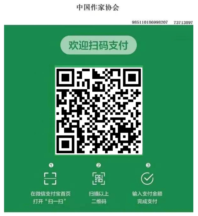 请扫描下方二维码,通过微信或支付宝将会费直接转入中国作家协会银行账号。
