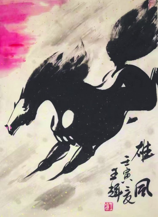 展开来,犹似一道神灵光带,自天庭而来。简洁的写意画面上,一轮红日灯笼状挂在天边,一匹骏马飞腾着,占据了画面中心,充满动势,大面积的留白,让你感觉到四处都是云团,每一朵都充盈着灵性,呼之欲来,舒卷自如,酣畅淋漓。这种线条勾勒的写意,既熟练也随性,看似不经意间的那么几笔勾勒,竟有着惊心动魄的效果。黄胄画驴,白石画虾,黄宾虹画松,各称一绝。这也让我对于写意绘画有了本质上的认知。俗话说“画龙画虎难画骨”,而画马者如今大有人在,曾看过许多人画的马,大多都是求形似或形神兼具。而王辉画马,则独行偏锋,甚至不那么注重传统的外形,而是将功夫皆用于内在的神韵上。感觉他几笔就能把马画出浮雕的效果,有的线条应该是弧线的他竟然大胆采用了直线,在神似方面,让我联想到昭陵的六骏图。这六匹刻在墙体上的千古骏马,形态各异,但至少有三匹呈飞腾状。我想,正是这种飞腾雄姿,给了王辉灵感,让他放飞笔下的骏马,且一发而不可收。