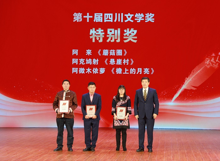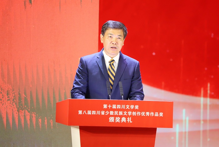 11月12日,第十届四川文学奖、第八届四川省少数民族文学创作优秀作品奖颁奖典礼在眉山市举行。四川省政府副省长罗强,四川省政府副秘书长刘全胜,中共四川省委宣传部副部长、省电影局局长王红芯,中共四川省直机关工委常务副书记王承先,四川省文联党组书记邹瑾,四川广播电视台党委书记、台长刘成安,中国作协副主席、四川省作协主席阿来,四川省作协党组书记、常务副主席侯志明,四川日报报业集团党委委员、副总编辑方小虎,四川省民族宗教委党组成员、副主任马飞,四川新华出版发行集团党委委员、副总经理罗军以及中共眉山市委书记胡元坤,中共眉山市委副书记、市长黄河等出席此次活动。