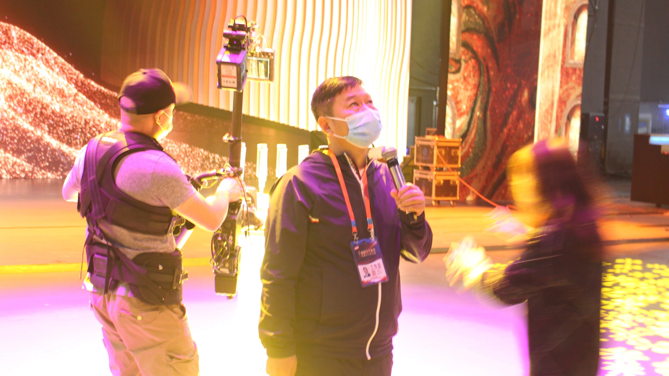 周雄:这次文学盛典从策划到执行,时间是最大的敌人之一,我们一直在与时间赛跑。因为时间紧,所以各方面的配备、磨合这种原本要耗费大量时间的环节都在压缩。每一分、每一秒,对我们来说都很珍贵。举个例子,为了抢时间,晚会走台彩排和硬件调整交替进行。我们的直播场地在中央歌剧院剧场,那里是专业剧院而非演播厅,舞台机械等控制装置频繁使用,需要和表演类节目、颁奖流程默契配合,无缝连接。节目组进场第二天,就开始合成排练,技术、传输、生产中台各工种协同相关合作方,结合首次排练情况,通宵对晚会的舞台、屏幕、机械装置、数控等硬件进行调整优化,并对重点环节进行反复演练。除了时间,节目组异地工作也是一大挑战,很幸运的是我们有强大的合作伙伴,北京电视台从技术装备、专业队伍等方面,对活动给予了宝贵的专业支持,让盛典的工作得以顺利进行。