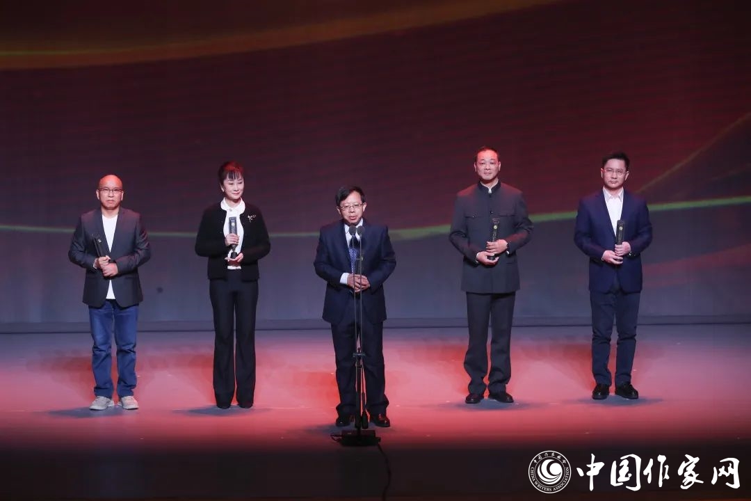 第八届鲁迅文学奖·中篇小说奖得主王凯、王松、索南才让、艾伟、责编季亚娅代葛亮领奖