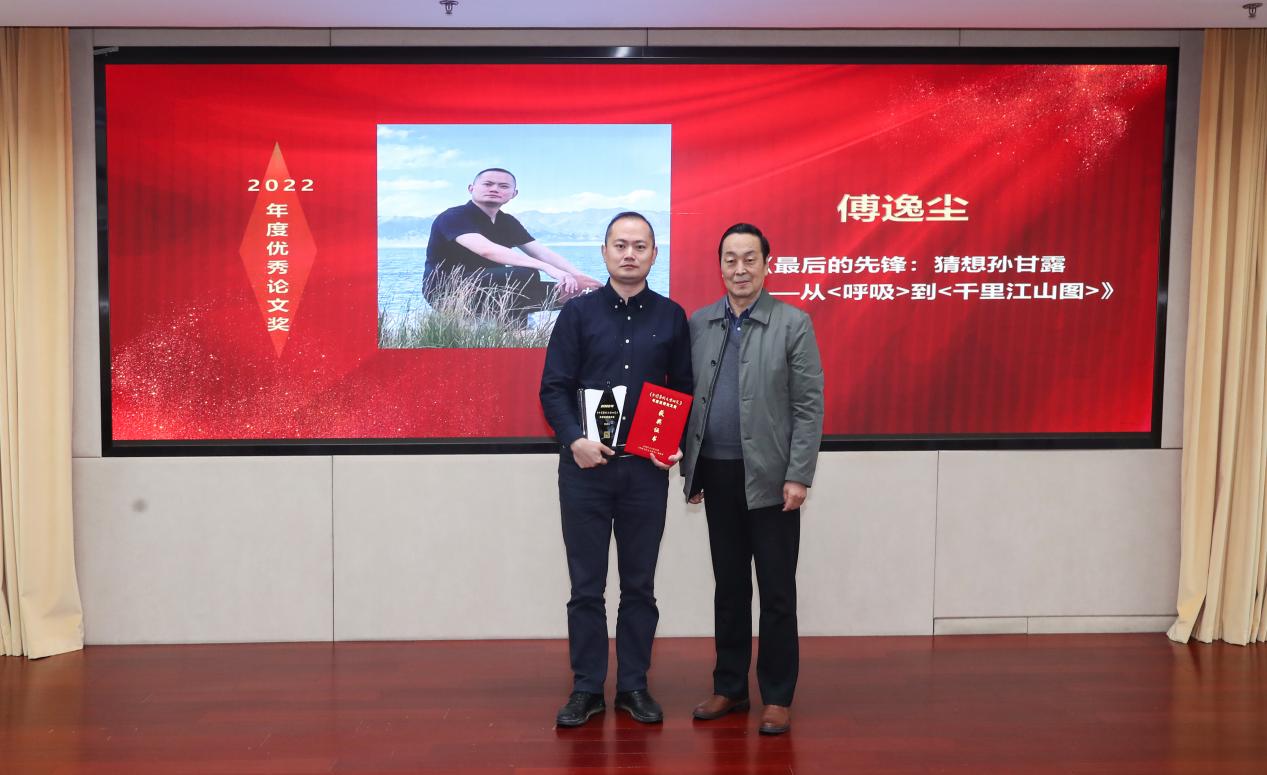 中国当代文学研究会名誉会长白烨为获奖者傅逸尘颁奖