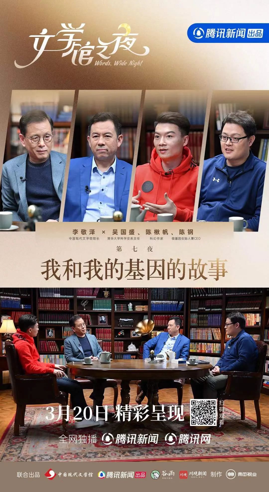 基因技术能否实现长生不老,它对人类社会意味着什么?在本季《文学馆之夜》的“最后一夜”,中国作协副主席、中国现代文学馆馆长李敬泽与清华大学科学史系主任吴国盛、科幻作家陈楸帆和微基因创始人兼CEO陈钢,从《自私的基因》《百年法》等书籍中对“基因”和“永生”的思考,拓展至当代社会生活中人们对科技与人文的讨论。在节目尾声,李敬泽说:“我们首先是一个生物学存在的人,但同时也是一个文化存在的人。”这不禁引人思考,在万物互联的时代,应如何将文学基因更好传承,让人类的文化存在生生不息、繁荣昌盛。