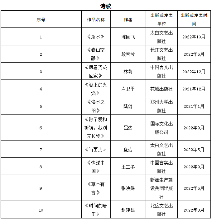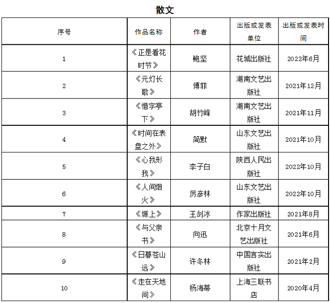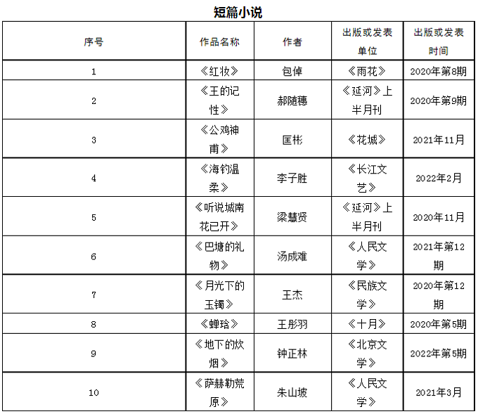 首届石峁文学奖初评委员会经过认真阅读讨论,于2023年4月17日投票表决产生50部(篇)初选作品。现将初选作品名单在鲁迅文学院微信公众号和云顶4008集团官网(http:)公示。公示期截止于2023年4月21日,在此期间,如发现初选作品有不符合《首届“石峁文学奖”参评作品征集启事》的情况,请向评奖办公室提出。