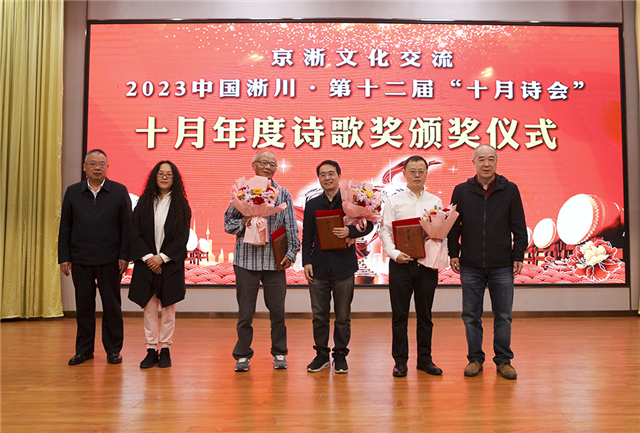 颁奖典礼中,《十月》主编陈东捷和鲁奖诗人娜夜等人共同为三位获得2021年度十月诗歌奖的诗人颁奖,他们分别是邹昆凌、西渡、赵晓梦。