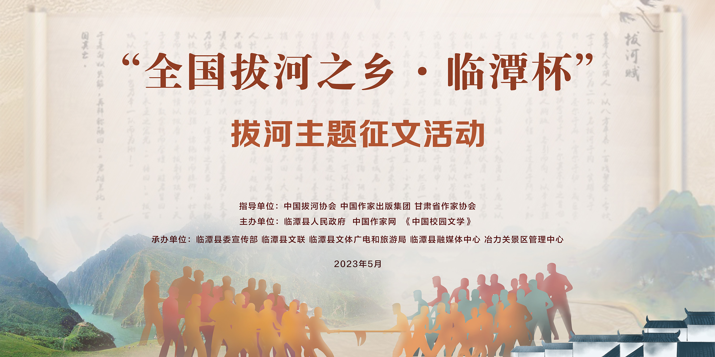 为深入贯彻落实党的二十大精神,弘扬全社会团结奋斗的精神标识,挖掘、刻画、弘扬、传播拔河运动承载的文化内涵和精神力量,助力全国拔河之乡·临潭县国家级非遗项目“万人扯绳(拔河)”文化品牌传播,增强中华优秀传统文化自信,经临潭县人民政府和中央定点帮扶单位中国作家协会商议,决定以文学的方式记述展示拔河这一群众体育、民俗活动的独特魅力,以汇集到的优秀文学作品丰富全国拔河文化发展成果,为脱贫县新时代经济社会高质量发展注入精神力量。值此今年7月2023“冶力关杯”中国拔河公开赛暨第七届甘肃·临潭拔河节(拟定名)即将举办之机,为配合赛事品牌宣传,进一步挖掘弘扬“一根绳,一条心,一股劲”的拔河精神,在中国拔河协会、中国作家出版集团、甘肃省作家协会等单位指导协作下,特面向全国举办该主题征文活动。