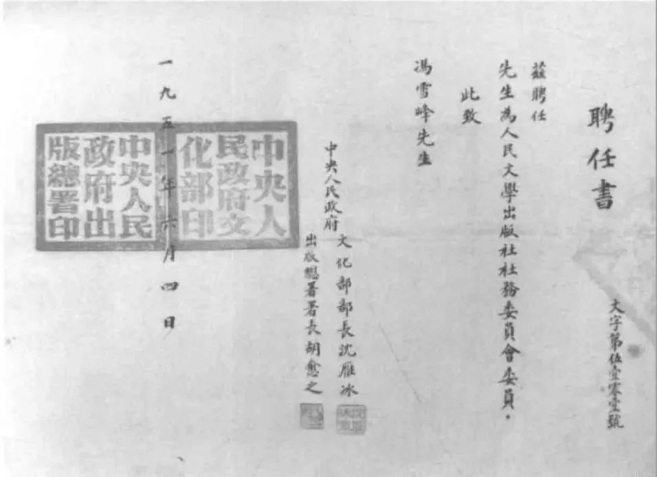 1951年6月4日,冯雪峰被中央人民政府文化部、出版总署聘任为人民文学出版社社务委员的聘任书