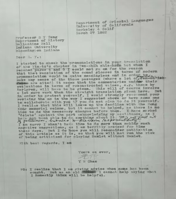 多年前,我曾阅读过赵元任自己撰写的《早年自传》和他人撰写的相关传记。2018年10月,在笔者应邀赴斯坦福大学作学术讲座期间,顺访了伯克利大学东亚图书馆。经过周欣平馆长批准,东亚图书馆特别提供了赵元任与外祖父邓嗣禹的九封往来信札,时间从1941年到1962年。其中包括在1942—1944年期间,两人分别在哈佛大学、芝加哥大学主持美军特训班的学术交流信息。这些珍贵的信札不仅反映了两人学术交往的诸多信息,而且可以弥补现已出版的《赵元任全集》和《赵元任年谱》中的不足之处。通过阅读这些珍贵的一手资料,笔者对赵元任先生有了更深刻的了解。