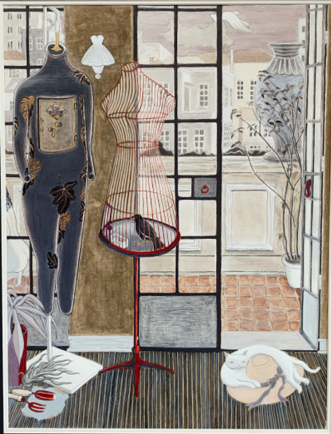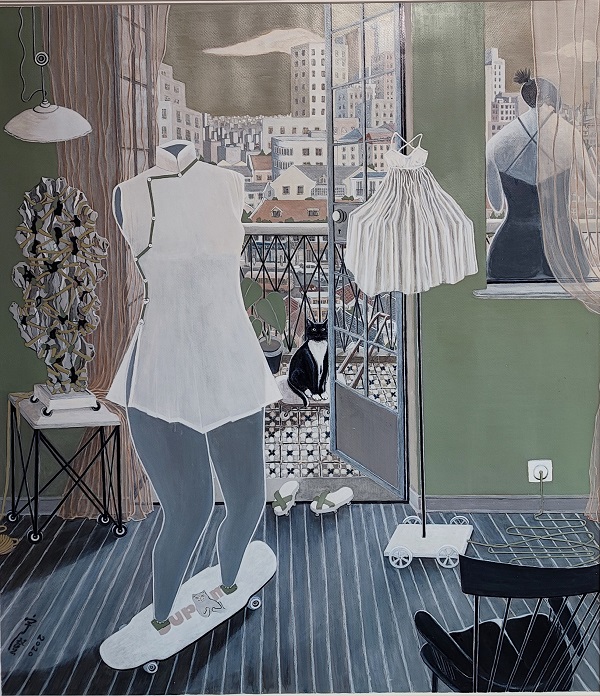 金宇澄的近作《阳台》,这张作品取自1940年代邬达克设计的“爱神花园”,也是金宇澄最熟悉的上海作家协会局部,提供另一种观看世界的特殊样式。透过窗格望向街道对面的洋房,房间里面的模特衣架犹如被剥去外衣的赤裸男女立在阳台的门前,而丰满女模特衣架被做成了鸟笼,一只乌鸦安静地站在鸟笼里面,鸟笼外面是慵懒的白猫在打盹儿,气宇轩昂的一对模特衣架仿佛是要出门参加派对的红男绿女,残败的蕨类植物被凌乱无序地切割下来,扔在精致的地毯上面。