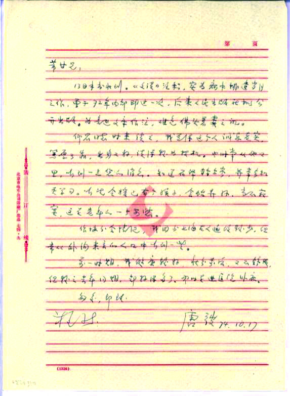 1974年10月17日唐弢给巴金写了一封书信,这封信珍藏在中国现代文学馆的书信库中。书信篇幅不长,内容丰富,字里行间透着唐弢和巴金之间的真挚友情以及对彼此的牵挂,真挚的话语让人感动又亲切。