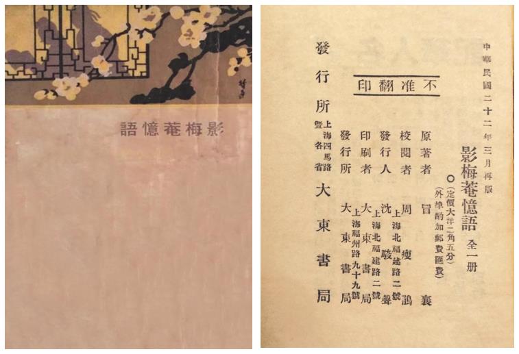 唐弢藏书《影梅庵忆语》(上海大东书局,民国二十二年再版本)封面及版权页