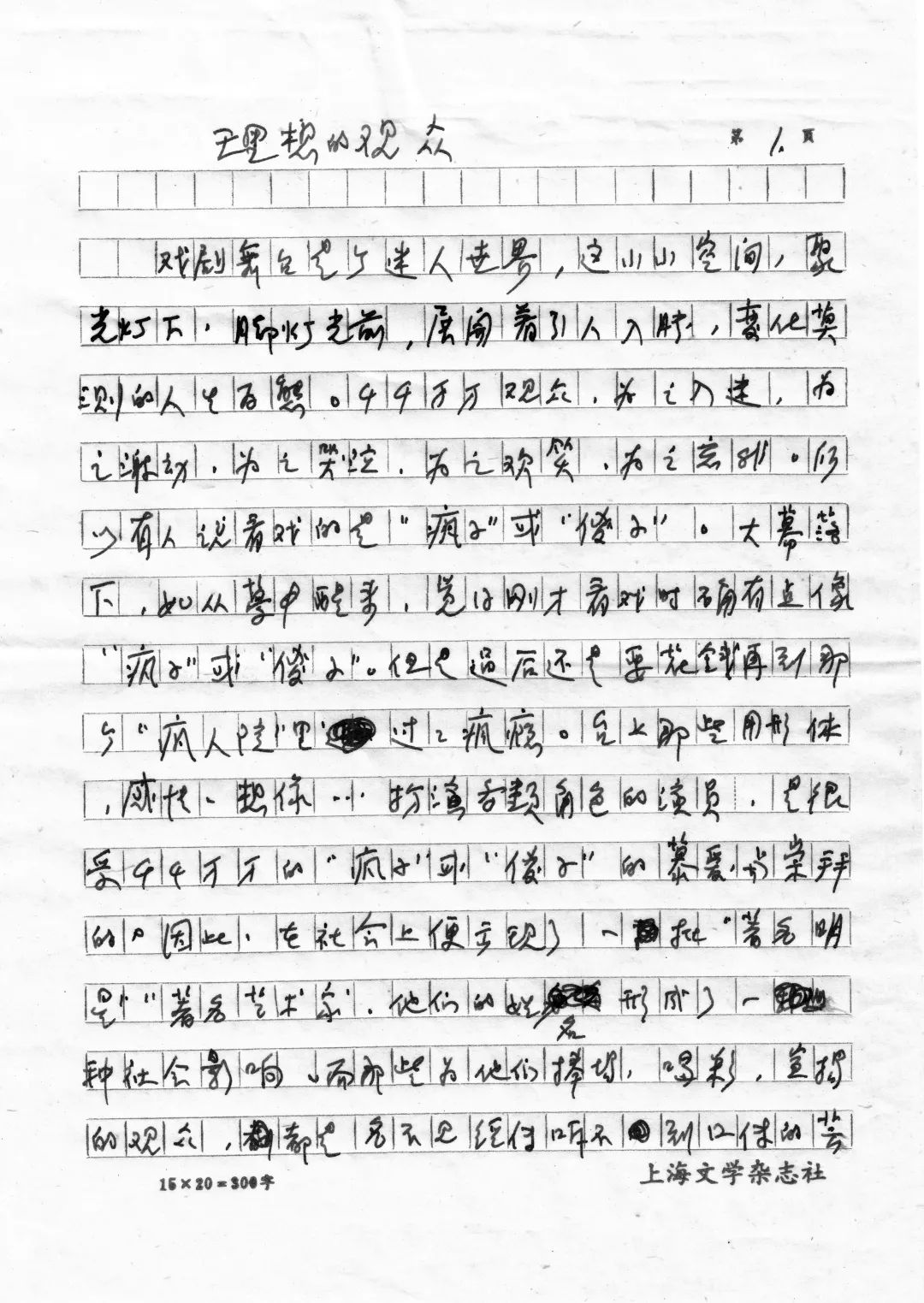 戏剧舞台是个迷人的世界,这小小空间,聚光灯下,脚灯光前,展开着引人入胜、变化莫测的人生百态。千千万万观众,为之入迷,为之激动,为之哭泣,为之欢笑,为之忘我。所以有人说看戏的是“疯子”或“傻子”。大幕落下,如从梦中醒来,觉得刚才看戏时确有点像“疯子”或“傻子”。但是过后还是要花钱再到那个“疯人院”里过过疯瘾。台上那些用形体、感情、想象…扮演各类角色的演员,是很受千千万万的“疯子”或“傻子”的慕爱与崇拜的。因此,在社会上便出现了一批“著名影星”“著名艺术家”,他们的姓名形成了一种社会影响。而那些为他们捧场,喝彩,宣扬的观众,都是名不见经传听不到口传的芸芸众生,古今中外只有著名的演员或明星,谁也没听过什么著名的观众。著名的观众明星,他们荣誉称号不是“疯子”便是“傻子”,这称号还得用钞票买入门票换来的。