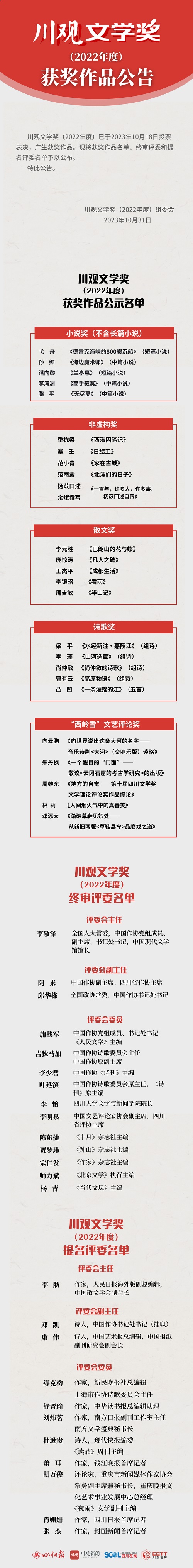经由李敬泽、吉狄马加、阿来、邱华栋、施战军、叶延滨、李少君、李怡、李明泉、陈东捷、贾梦玮、宗仁发、师力斌、杨青等14位著名作家、学者和重要文学刊物主编组成的终审评委会认真审阅、投票,组长复议,评委会主任审定确认等程序,最终产生川观文学奖(2022年度)获奖作品名单。