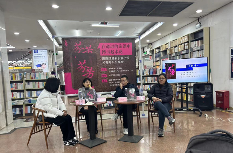 12月10日下午,以“在命运的旋涡里搏击起水花”为主题的周瑄璞最新长篇小说《芬芳》分享会在西安新华图书大厦举行。活动由西安外国语大学教师王昱涓主持,作家、鲁迅文学奖得主弋舟,评论家、文学博士孔会侠,《芬芳》作者周瑄璞参加活动