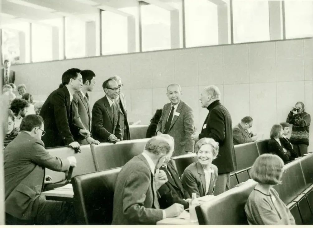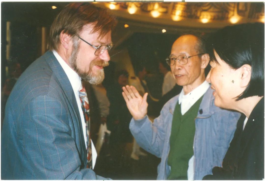 1996年4月,贾芝(中)在主持国际民间叙事研究会北京学术研讨会期间,与国际民间叙事研究会主席雷蒙德(左一)交谈,右一为金茂年
