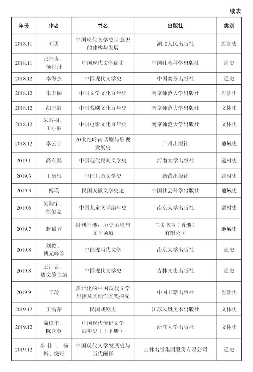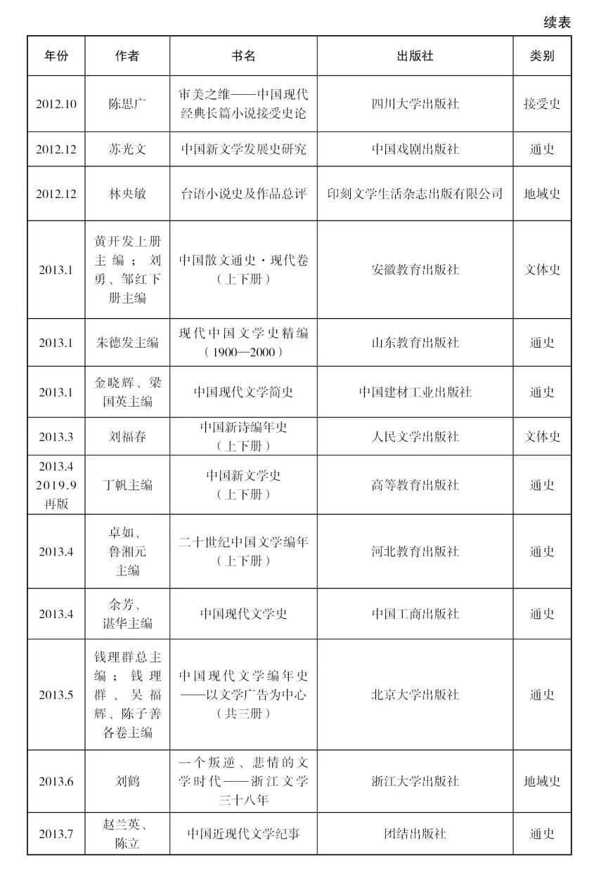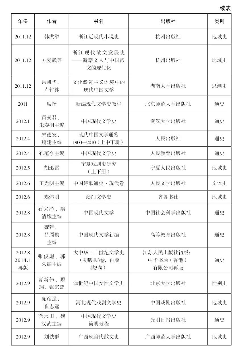 [29]该著第一版出版于1999年,主编为朱栋霖、丁帆、朱晓进,后又由高教社和北京大学出版社出版了多个版本。笔者在整理近十年文学史著作目录时,为了保持体例一致,对于这些初版本已经在此前的目录中收录过、但最近又出新版的著作,一概没有收入。