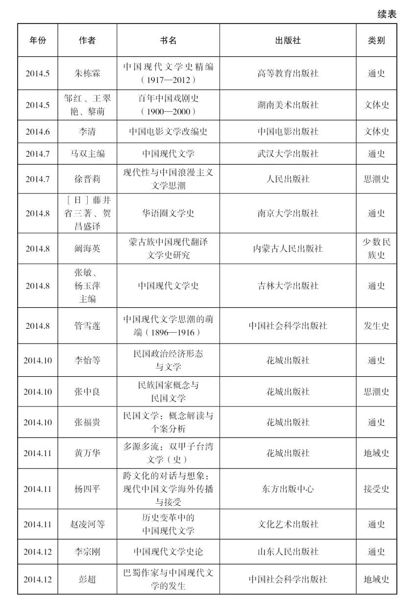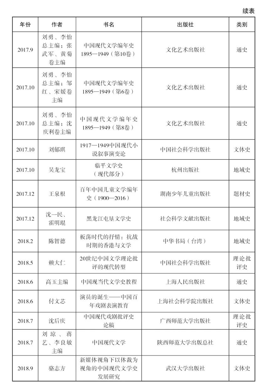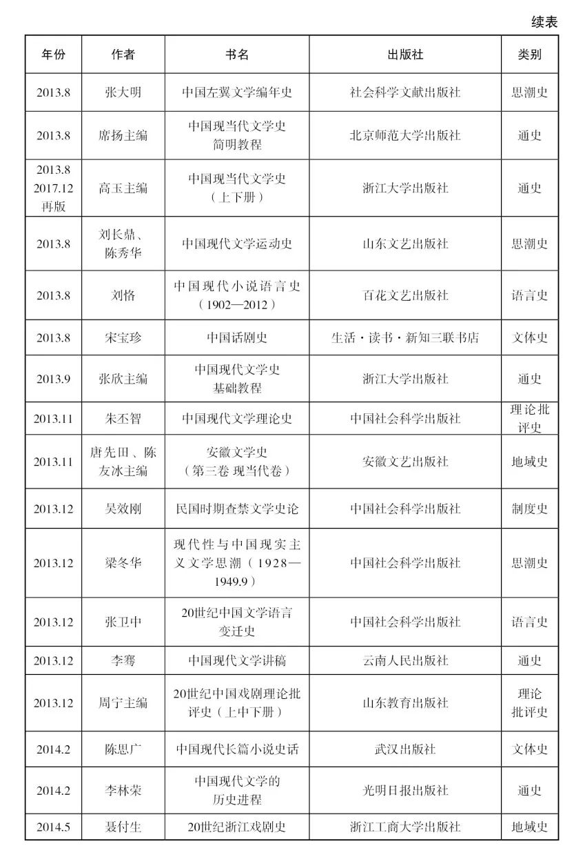 [29]该著第一版出版于1999年,主编为朱栋霖、丁帆、朱晓进,后又由高教社和北京大学出版社出版了多个版本。笔者在整理近十年文学史著作目录时,为了保持体例一致,对于这些初版本已经在此前的目录中收录过、但最近又出新版的著作,一概没有收入。