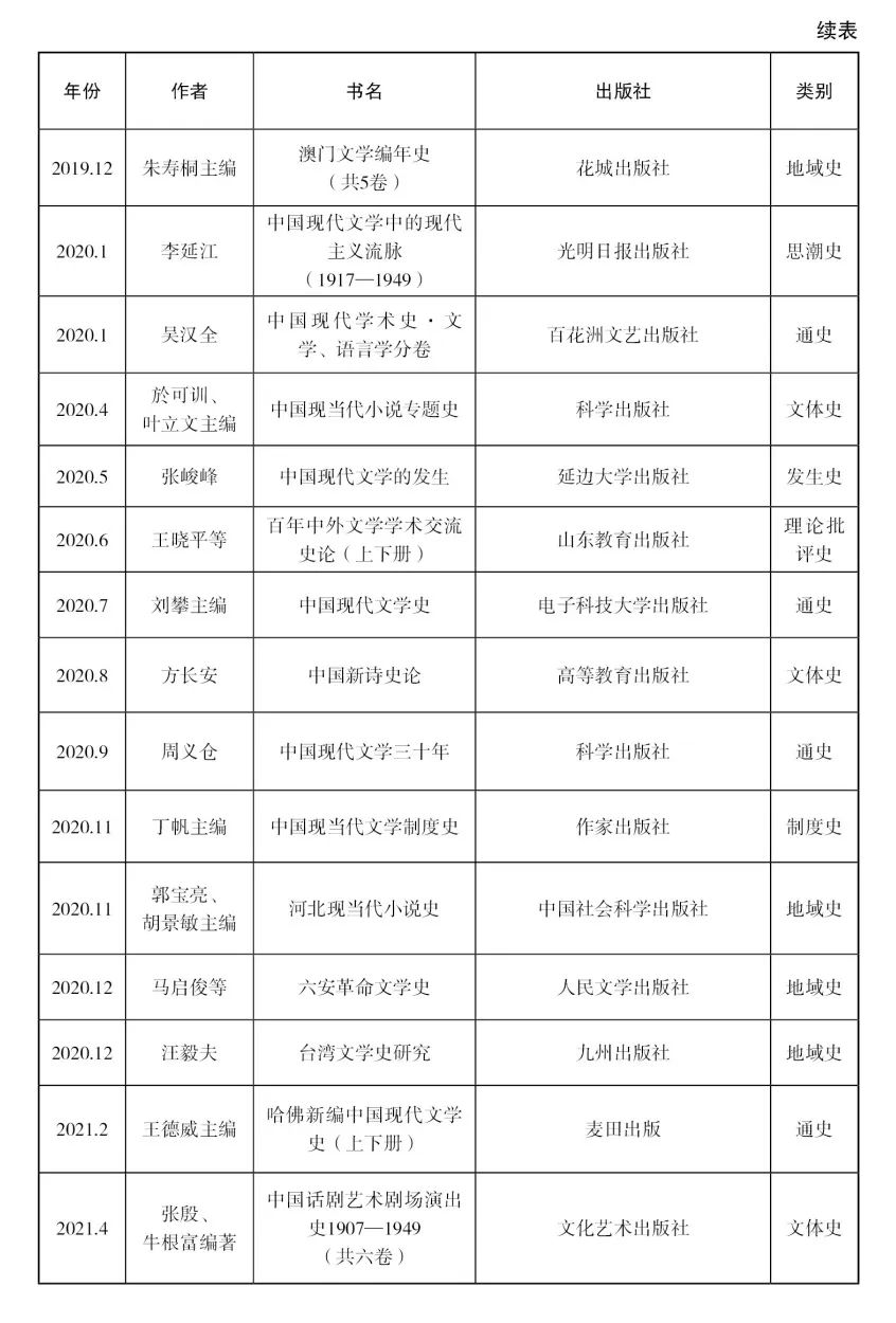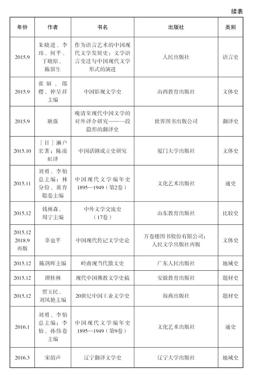 其实,类似这样的疑问,在十多年前我们已经有足够的理由提出,但只要把近十余年来产生的文学史著作和此前的著作对比一下,就完全不必悲观:仅以本文附录中所列出的188部文学史著作而论,其中固然不无低水平重复之作,但我们还是能从中看出众多文学史家可贵的探索和尝试。首先,从文学史的研究对象来说,一方面,许多以往难以“入史”的文类,近年来纷纷进入各种现代文学通史;另一方面,某些文学史要素如文学制度、文学语言等,在以往的文学史著中虽会被提及,却很少成为独立的研究对象,而最近出版的相关专史,便具有了填补空白的意义。其次,就文学史编纂体例而言,黄修己先生在近三十年前曾经将现代文学史的体例归为四类,即作家论型、文体史型、专题史型和混合型[30],这种分类在当时可以囊括绝大多数文学史著作,但今天来看,不仅超出这四种类型之外的文学史著作已屡见不鲜,而且即使在同一种体例之内,也可能包含着著史者截然不同的文学史意识,因而显现出彼此迥异的面貌,本文所讨论的编年史就是最典型的例子。最后,在文学史观念层面,诸如现代中国文学、民国文学等观念的讨论和实践,至少可以引发我们对于诸多文学史问题的深入思考,至于像《哈佛新编中国现代文学史》那样的打通文史的尝试,更是让人耳目一新,尽管它能否产生更加深远的影响尚需时间来检验。