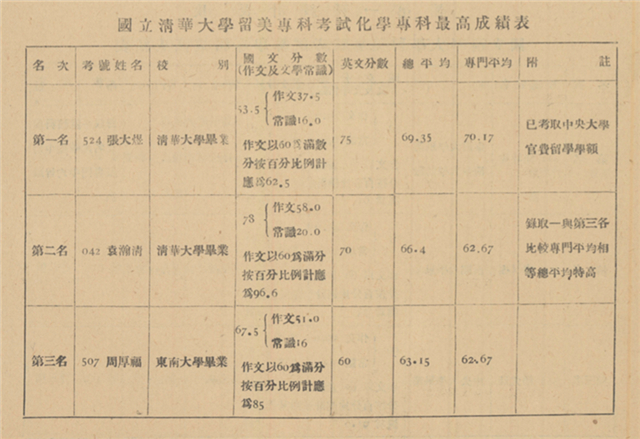 国立清华大学留美专科考试化学专科最高成绩表