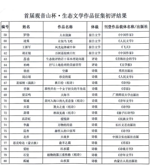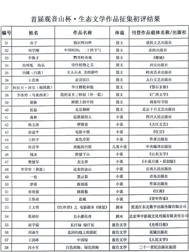 首届观音山杯·生态文学奖入围名单(排名不分先后)