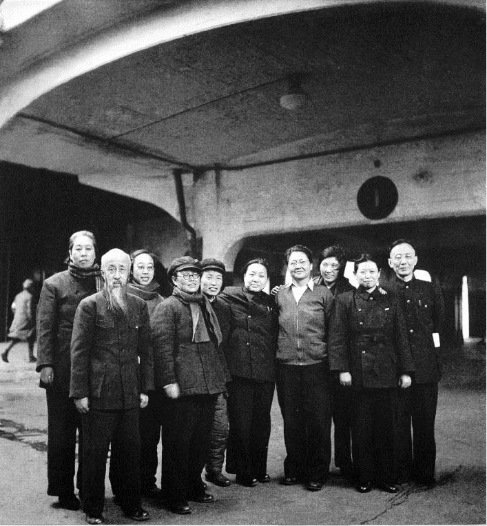 许广平(左一)、沈钧儒(左二)、郭沫若(右一)、罗淑章(右三)、李德全(右四)等民主人士离开沈阳前在火车站合影。