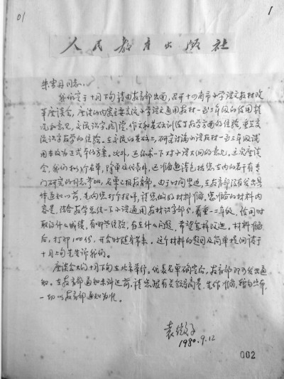 “朱雪丹同志:我们定于十月下旬请教育部出面,召开十四省市小学教材改革座谈会,座谈的内容主要交流小学语文通用教材一至三年级的试用情况和意见,交流识字、阅读、作文和基础训练等教学方面的经验,重点交流识字教学的经验。在交流的基础上,研究讨论小学教材一至三年级试用本改为正式本的方案。”(1980.9.12日信。下文无特别注明的,均引用自103封信)