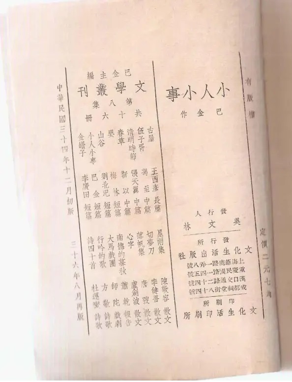 已经收入《巴金全集》第十一卷(人民文学出版社2000年4月版)的《小人小事》,书前有全集编者的说明:“《小人小事》一九四五年十二月由文化生活出版社初版,迄一九四七年八月,共印二版(次)。”此书列为有名的文生社“文学丛刊”第八集之一。那么,《小人小事》果真是一九四五年十二月初版的吗?答案:是,又不是。此话何讲?因为我刚刚得到一本《小人小事》土纸本,版权页所示,同样是文化生活出版社初版,初版时间是一九四三年四月,桂林文化生活出版社推出,列为文生社另一套“文学小丛刊”第三集之一。书名相同,作者也同一人,怎么会有两种不同出版时间的初版本呢?