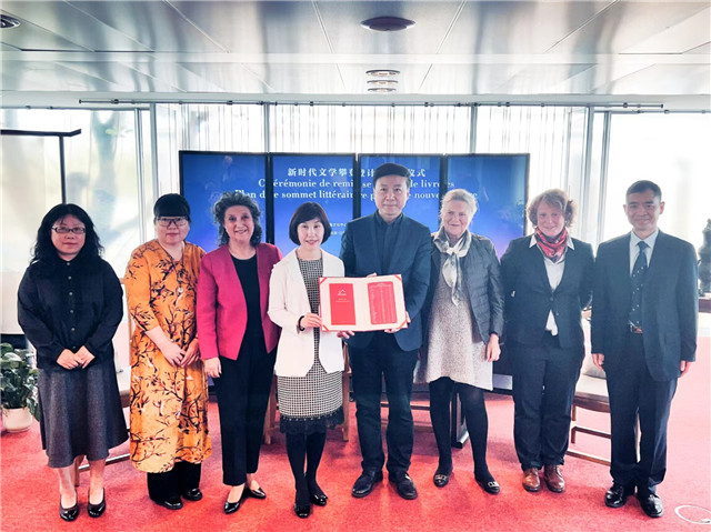 在法国巴黎中国文化中心举办的“新时代文学攀登计划”赠书仪式上,中国图书进出口(集团)有限公司总经理林丽颖向巴黎中国文化中心主任刘红革赠送了“新时代文学攀登计划”前三期已出版的作品,共24种、50册。这些文学作品从不同侧面为法国品读新时代“书香中国”、感知中国式现代化搭建了新的平台,对于促进两国人民间的相互理解和友谊具有重要的文化意义。
