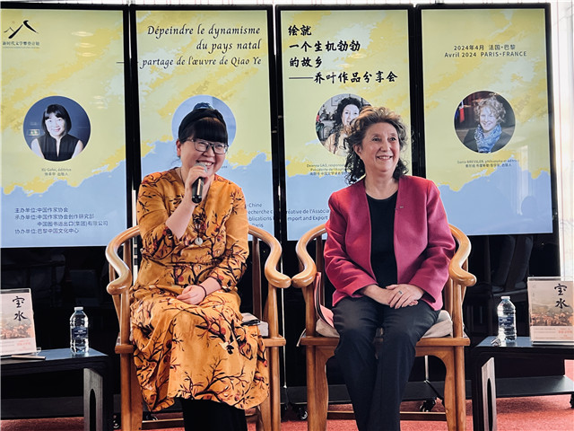 赠书仪式后举行了“绘就一个生机勃勃的故乡”——乔叶作品分享会。作家乔叶与法中文化协会创办主席高醇芳、法国丝路出版社社长索尼娅·布雷斯勒围绕《宝水》的创作展开深入交流。《宝水》较为全面地展现了新时代中国农村的变革和生活的多维度内涵,呈现出中国式现代化实践的生动景象。索尼娅·布雷斯勒分享了她对中国农村的印象,认为中国的农村是“国家心脏的跳动之地”,并对《宝水》中描绘的人与人之间的联系,以及作者用细腻笔触和诗意语言所表达的情感给予高度评价。她认为,书中丰富的细节描写,使读者得以全面、深入、客观地了解中国社会的精神面貌,并深入中国人的内心世界。作为一位对中国古典文学和现当代文学都有深刻理解的翻译家,高醇芳特别提到了乔叶在《宝水》中巧妙融合古诗元素的手法,认为这种融合不仅让读者在阅读的过程中产生共鸣,更展现了古代诗歌在中国当代文学中的独特魅力,具有跨越时代的世界性意义。“这是一面镜子,通过一个现代女性在故乡重新寻根、寻健康、寻活力、寻幸福的经历,折射出山乡的动态变迁和中国农村生活的内在肌理。”谈及创作感悟,乔叶表示,她曾走访江西、甘肃、贵州等中国10多个省,深入了解中国乡村的多样性,最后以故乡河南作为主要原型,结合走访中的见闻,塑造了“宝水”这个生机勃勃的村庄,以此展现中国乡村当下的普遍状态,并探讨个人成长、人与故乡的关系,也期待这部小说能在法国读者心中产生共鸣。