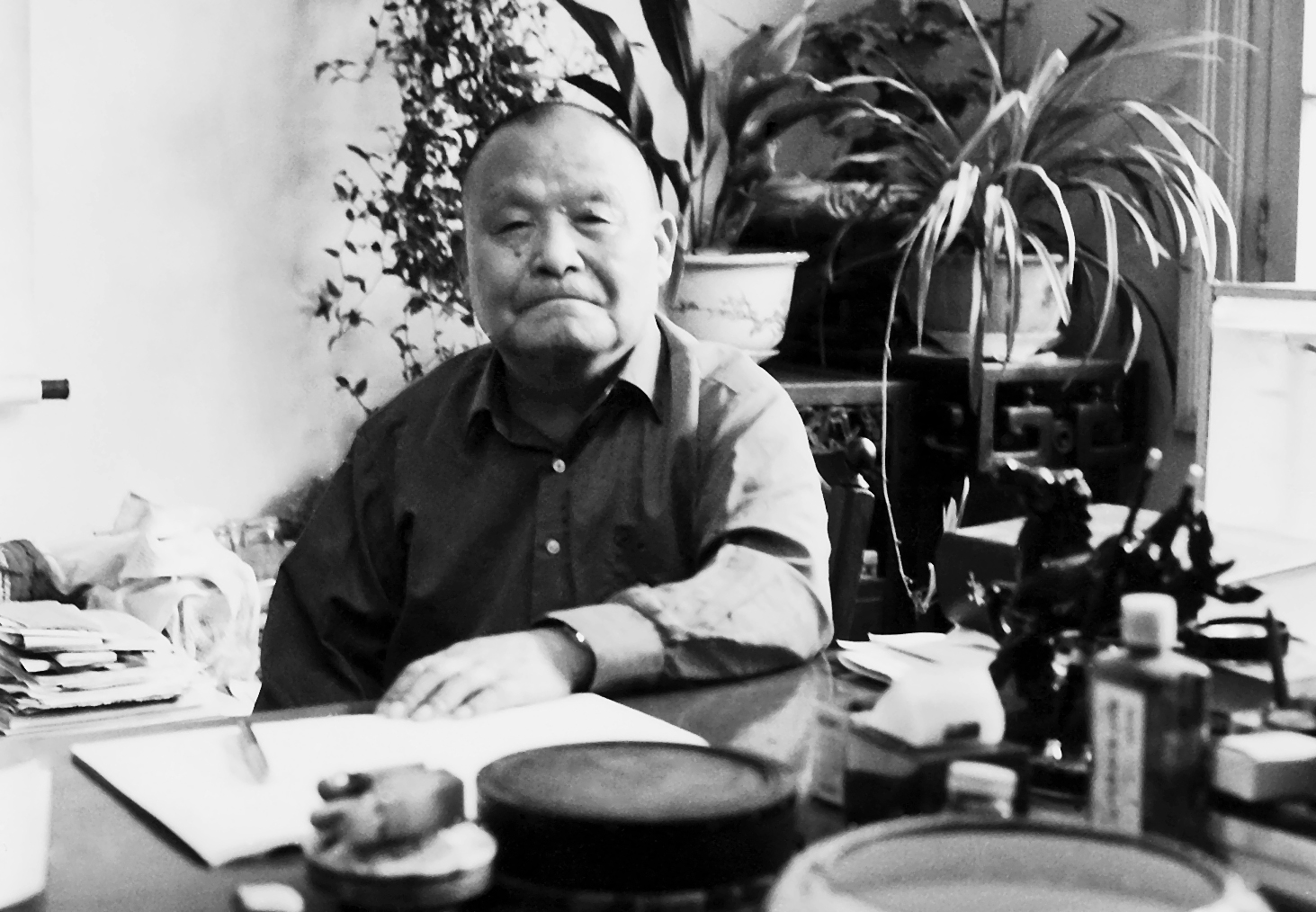 梁斌先生最后一次入住医院治疗是1994年。那一次他住了2年。经天津市总医院的大夫、护士精心治疗和护理,他的病情稳定下来。他叫人在病房里支起画案,重新挥毫作画。梁斌的画作,被誉为红色文人画。他在蠡县高小曾接受过正规的美术训练,绘画基础扎实。他的书画题材与他的革命生涯息息相关。北方农村的瓜棚豆架、白洋淀的映日荷花、太行山的嶙峋山姿、武汉江边的清秀风光,都是他百画不厌、推陈出新的绘画题材。他画荷花荷叶,水墨淋漓,一花一叶见白洋淀浩渺云烟;他画枇杷葫芦,果实丰满,枝枝蔓蔓缠绕着乡土气息;他的焦墨山水更独树一帜,千里太行一派荡荡长风。
