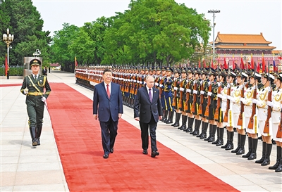 5月16日上午,国家主席习近平在北京人民大会堂同来华进行国事访问的俄罗斯总统普京举行会谈。这是会谈前,习近平在人民大会堂东门外广场为普京举行隆重欢迎仪式。新华社记者 饶爱民摄