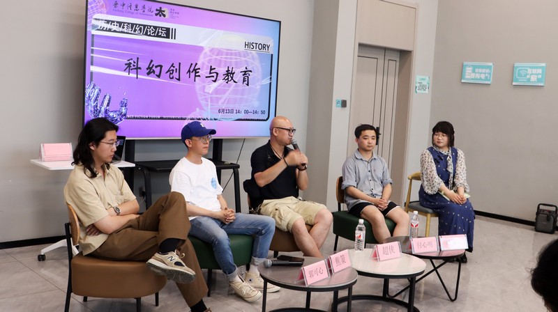 6月13日下午的“科幻创作与教育”论坛上,超侠、焦策、付心明、郭可心围绕“高考作文题目中的科幻热”、“科幻启蒙之路”等话题展开交流。焦策结合自己向中小学学生开展科幻讲座的经验,指出科幻是一种颇具时间感的生活方式,历史可能在五分钟之前就已经确定,但却能改变未来,这是属于科幻的独特想象。郭可心、付心明表示,科幻与教育的过程,是双向的,处于日常思索与想象创意之中,科幻创作需要解决好对科学的理解与把我,以及文学的书写和幻想。本论坛由太古科幻学院教师扈逸文主持。