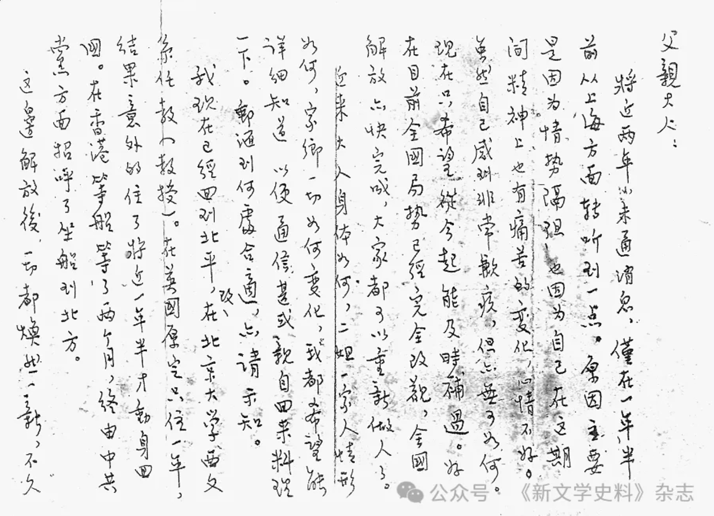 这边解放后,一切都焕然一新,不久全国解放了,前途希望无穷,令人非常兴奋。北平现在是中共中央所在地,许多重要会议都在这里举行,将来国都大致也就在这里。大家虽然穷,空气却热烈紧张。我们在大学教书的,生活不像抗战以来多少年那样的毫无保障了,大家忙于学习政治理论,了解当前策略,认真从各方面为人民服务。我自己十年前本就已经向这条路上走出了第一步,只是当初认识得还不深,到了不同的环境里又有点模糊,因此走了许多冤枉路,现在想来可以弄澈底了。家乡的年轻人大致都已经头脑清楚了吧?